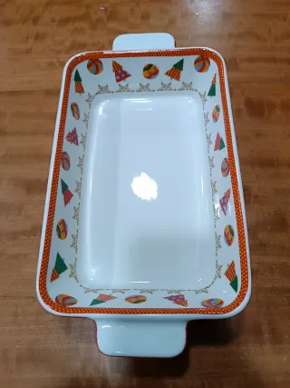 Tegame rettangolare in ceramica con un allegro decoro a tema natalizio. Perfetto per preparare le tue ricette preferite. - Bordo decorato con alberelli, palline e caramelle. - Manici laterali per una presa sicura. - Finitura lucida. In offerta da € 29.00 a € 18.00