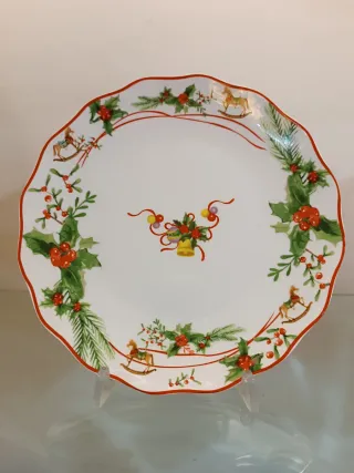 Set di 6 piatti da dessert con un delizioso tema natalizio. Perfetti per le feste. - Decorazione con agrifoglio, campanelle e cavalli a dondolo. - Bordo festonato con finitura rossa. Diametro cm 21 In offerta da € 58.00 a € 39.00