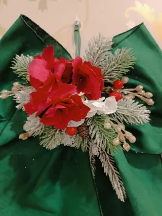 Bellissimo fiocco decorativo per il Natale, perfetto per aggiungere un tocco festivo alla tua casa. - Realizzato in tessuto resistente. - Dettagli floreali rossi e verdi. - Decorazioni innevate e bacche rosse. In offerta da € 40.00 a € 15.00