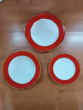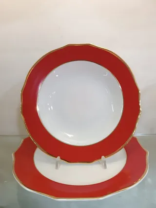 Elegante servizio da tavola per 6 persone, composto da 18 pezzi. Il design presenta un bordo rosso con dettagli dorati che aggiungono un tocco di raffinatezza. - Set completo per 6 coperti. - Bordo decorativo rosso. - Finitura con dettagli dorati. Disponibile anche per 12 persone