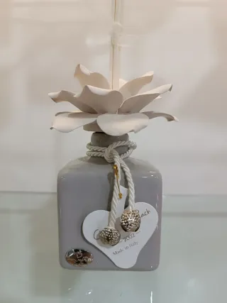 Profumatore per ambiente in ceramica con decorazione floreale e cuore. - Finitura grigia. - Dettagli in corda e metallo. - Made in Italy.