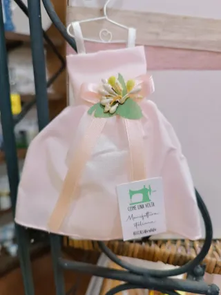 Delizioso vestitino bianco, perfetto per bambole o come bomboniera. - Decorato con un fiocco rosa. - Dettaglio floreale applicato. - Realizzato in tessuto. - Etichetta Made in Italy inclusa.