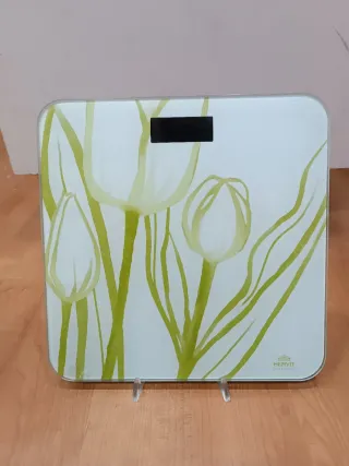 Bilancia digitale Hervit con un design floreale. - Superficie in vetro bianco. - Motivo di tulipani verdi. - Display digitale nero.