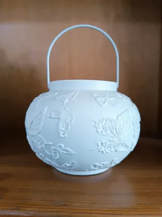 Delicata lanterna in porcellana biscuit, perfetta per aggiungere un tocco di eleganza. - Decorata con rilievi di farfalle e fiori. - Manico superiore per un facile trasporto. Diametro vm 12, altezza cm 9