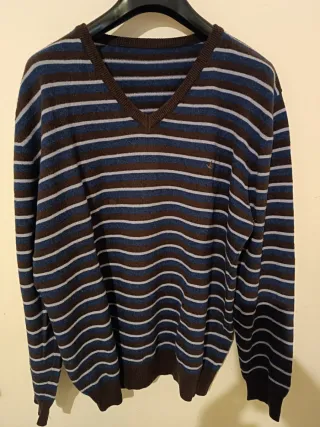 Pullover da uomo a righe in 100% lana. Un capo classico e confortevole. - Fantasia a righe orizzontali. - Scollo a V. - Manca l'etichetta perché si è staccata, ma la marca si evince dal ricamo e dall'etichetta interna che riporta il nome dell'azienda produttrice proprietaria del marchio.