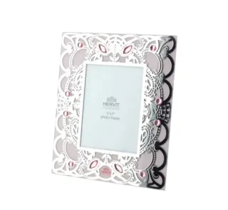 Elegante cornice portafoto Hervit, modello Byzantium, con dettagli decorativi. - Design ricercato con finiture argentate e rosa. - Inserti decorativi a forma di maschera e motivi floreali. - Applicazioni di strass rosa. - Adatta per foto 12,5x17 cm. Dimensioni 24x29