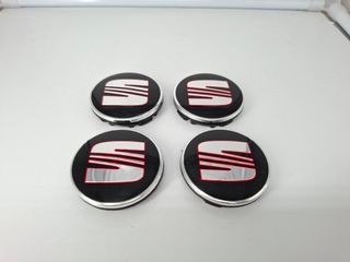Set di 4 coprimozzi per Seat. - Diametro: 56mm. - Logo Seat. - Colore nero con finiture rosse e logo cromato.