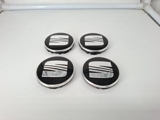 Set di 4 coprimozzi per cerchi Seat. - Diametro: 56mm - Logo Seat in rilievo - Finitura nera lucida con bordo cromato