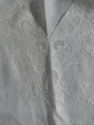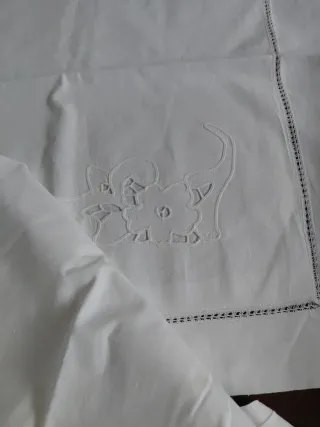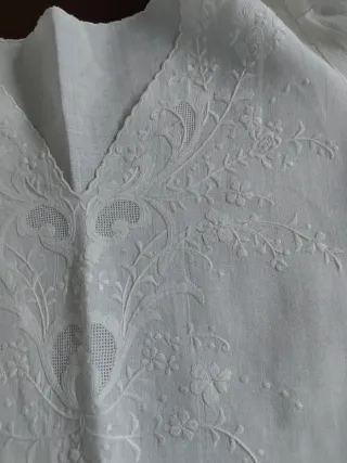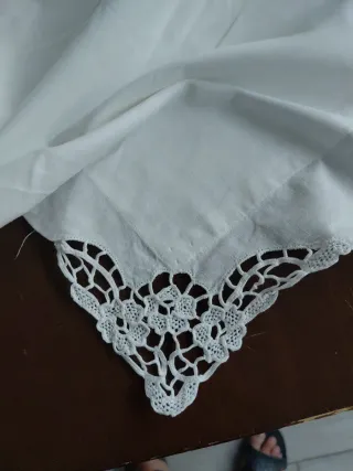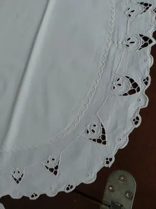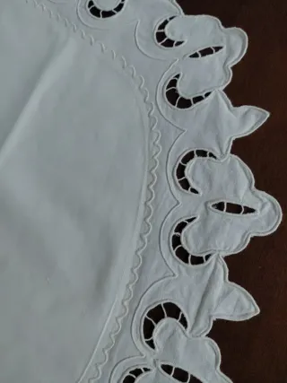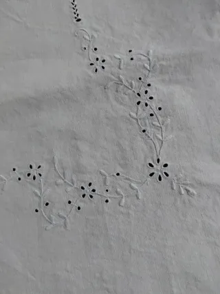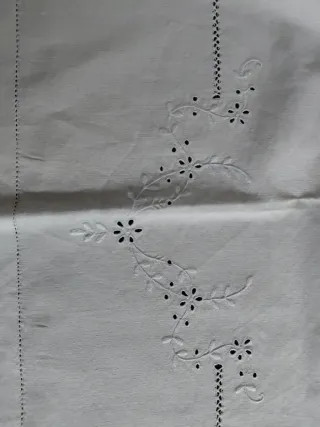 Tovaglia in lino con ricami floreali e bordi traforati. Nuova, mai usata.per altate - Misure: 135x90 cm. - Materiale: Lino. - Colore: Bianco. - Dettagli: Ricami floreali e bordi traforati.