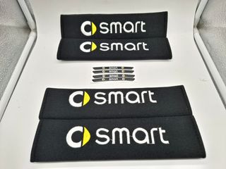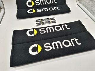Set di accessori per auto Smart. - Copri cinture di sicurezza neri con logo Smart ricamato. - Adesivi con logo Smart.
