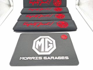 Set di accessori per auto MG. - 4 protezioni per cinture di sicurezza con ricamo rosso. - 1 tappetino antiscivolo con logo MG e scritta MORRIS GARAGES.
