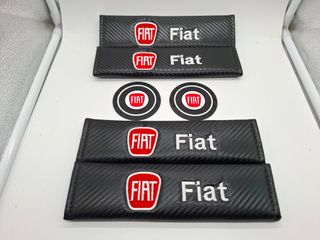 Set di accessori per auto Fiat. - Copri cinture di sicurezza con logo Fiat. - Tappetini rotondi con logo Fiat.