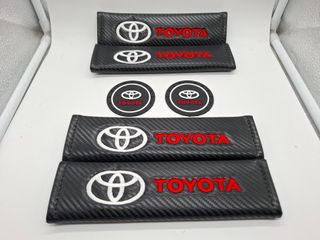 Set di accessori per auto Toyota. - Copri cinture di sicurezza in carbon look. - Toppe rotonde con logo Toyota.