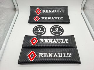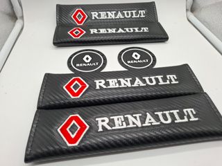 Set di accessori per auto RENAULT. - 2 copri cinture di sicurezza. - 2 adesivi rotondi.