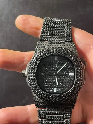 Elegante orologio da uomo con una finitura scintillante su tutto il quadrante e il cinturino. - Design accattivante con brillantini. - Dettagli in argento e nero.