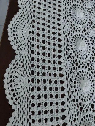 Elegante tovaglietta in filet con motivo a rete del pescatore, realizzata a mano. Le sue dimensioni sono 85x85 cm. - Motivo a rete del pescatore. - Lavorazione artigianale. - Dimensioni: 85x85 cm.