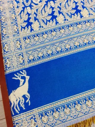 Prezioso tappeto con decorazioni raffinate e frange dorate. - Misure: 159x190 cm. - Motivo centrale con cervo stilizzato. - Bordi decorati con motivi floreali e geometrici.