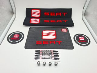 Seat accessori auto il kit comprende: 4 copriruota adesivi 2 portabicchieri da 7cm di diametro 4 coprivalvole ruote 1 tappetino cruscotto 2 copricintura in cotone