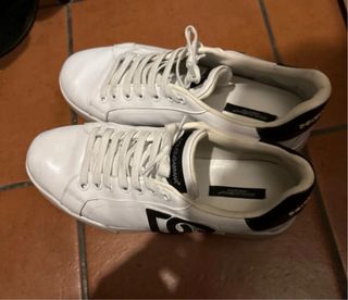 Sneakers Dolce & Gabbana in pelle bianca con dettagli neri. - Logo D&G applicato lateralmente. - Inserti neri sul tallone. - Lacci bianchi. - Suola in gomma.