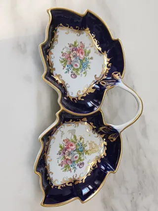 Elegante antipastiera in porcellana di Limoges, con un design a forma di foglia. - Decorata con motivi floreali dipinti a mano. - Bordi e dettagli in oro zecchino. - Colore blu intenso. - Misure:cm23 xcm12.