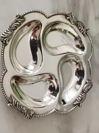 Elegante antipastiera in Sheffield quadrilobata con 4 scomparti a forma di foglia , perfetta per servire stuzzichini, antipasti, salse etc. La punzonatura a retro indica che proviene da Sheffield, il "leone passante "invece garantisce che si tratta di argento 925 Sterling e la lettera B dentro lo scudo indica il periodo (Giorgio V, cioè primi del "900 ). - Design a quattro scomparti. - Bordo decorato con motivo a perline. - Dettagli ornamentali sui bordi.