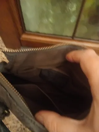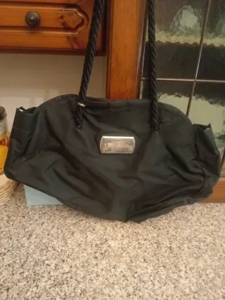 Borsa da donna in tessuto nero, con manici in ecopelle. - Chiusura con zip. - Tasca interna. - Fodera interna chiara.