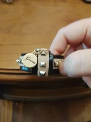 Elegante bracciale Guess da donna, perfetto per polsi sottili. Un accessorio che aggiunge un tocco di stile. - Design con borchie dorate. - Chiusura a bottone a pressione. - Charm pendente con logo.