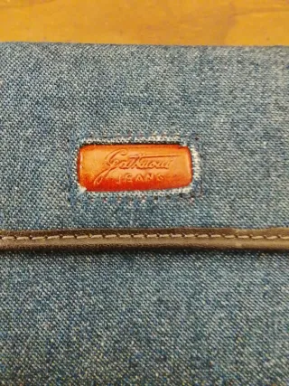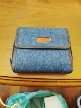 Portafoglio in denim con dettagli in pelle. - Chiusura con zip. - Tasca esterna con bottone a pressione. - Logo in pelle applicato sul davanti.