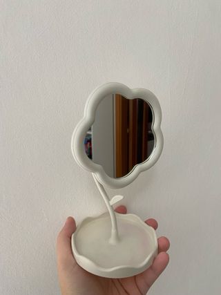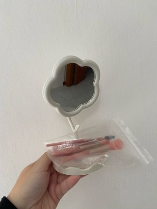 Set composto da uno specchietto a forma di nuvola e un set di pennelli per il trucco. - Specchietto con cornice bianca. - Pennelli con manici rosa e setole arancioni. VENDO PER INUTILIZZO