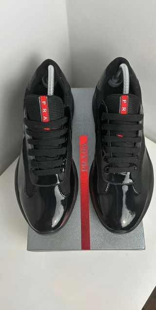 Scarpe Prada modello Cups. - Tomaia in mesh e vernice. - Dettagli rossi. - Suola in gomma.