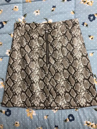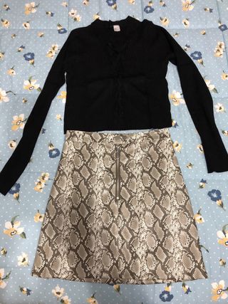 Completo composto da: - una maglia a costine nera, con intreccio sul davanti e maniche lunghe - una gonna corta con stampa pitonata. - una gonna corta con volant brillantinato Taglia S