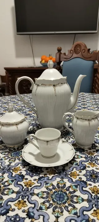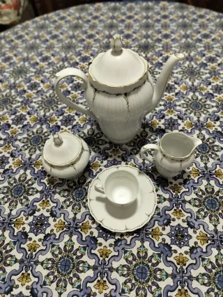 Elegante servizio da caffè in porcellana, con dettagli dorati che aggiungono un tocco di raffinatezza. - Teiera - Zuccheriera - Lattiera - Tazzina con piattino 11 pezzi