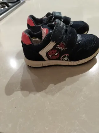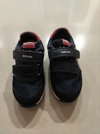 Scarpe da bambino Geox con chiusura a velcro, ispirate a Marvel. Presentano dettagli blu e rossi. - Logo Geox sulla chiusura in velcro. - Etichetta Marvel sulla linguetta.