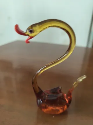 Delizioso oggetto decorativo in vetro soffiato, perfetto per aggiungere un tocco di colore e originalità alla tua casa. - Realizzato in vetro soffiato. - Design a forma di animale con collo lungo e lingua rossa. - Colori vivaci: giallo e rosso.