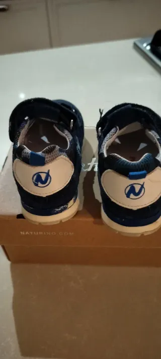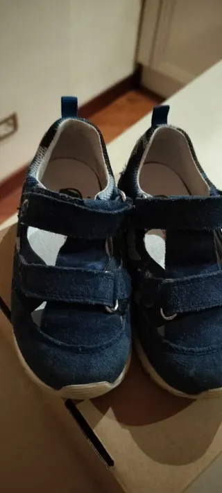 Sandali da bambino in morbida pelle scamosciata blu. - Chiusura con tre velcri regolabili. - Tessuto a fantasia sul collo del piede. - Linguetta posteriore per facilitare la calzata.