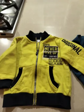 Set di due felpe per bambino, una gialla con zip e una blu con stampa. - Felpa gialla con zip frontale e colletto alto nero. - Stampa NEVER GIVE UP sulla felpa gialla. - Felpa blu con stampa a tema spaziale (razzi, pianeti). - Dettagli grafici colorati sulla felpa blu.