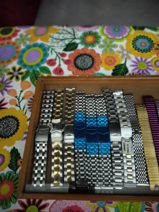 Set di cinturini per orologi in diverse finiture. - Finitura oro lucido - Finitura argento lucido - Finitura argento spazzolato - Finitura oro spazzolato - Cinturino viola - Cinturino blu - Cinturini di varie misure a partire da 10,00€ a 30,00€