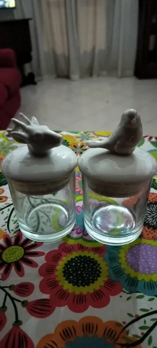 Set di due contenitori con decorazioni a tema animale. - Un contenitore ha un coperchio con una decorazione a forma di cervo. - L'altro contenitore ha un coperchio con una decorazione a forma di uccellino. - Realizzati in vetro e ceramica.