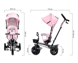 Triciclo modulabile di colore rosa, ideale per i più piccoli. - Seduta imbottita e confortevole. - Cappottina parasole regolabile. - Manubrio direzionabile. - Cestino portaoggetti anteriore. - Pedali antiscivolo.