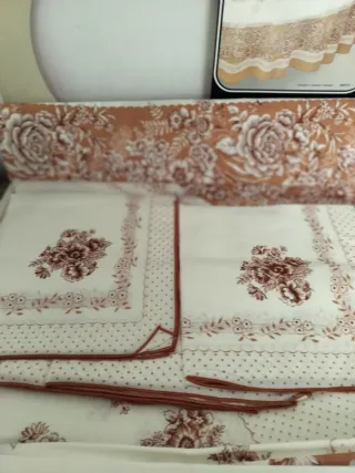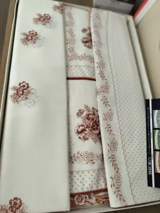 Elegante tovaglia da 12 con un delicato motivo floreale, più tovaglioli. - Fantasia floreale marrone su sfondo bianco. - Bordo decorato con motivo a pois e festoni. - Tessuto di qualità.
