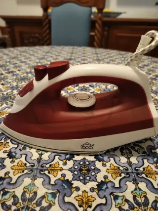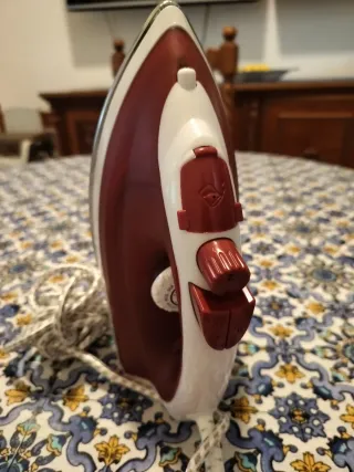 Ferro da stiro piccolo comodo da viaggio di colore bianco e bordeaux. - Manopola per la regolazione della temperatura. - Base in metallo. - Marchio DCG.