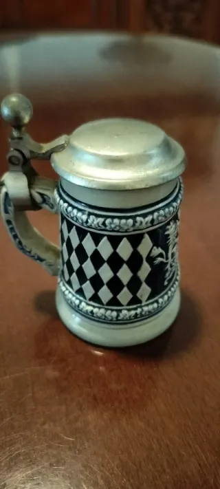 Boccale in ceramica con decorazioni a rombi e stemma. - Coperchio in metallo con pomello. - Manico decorato. - Design tradizionale.