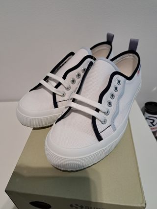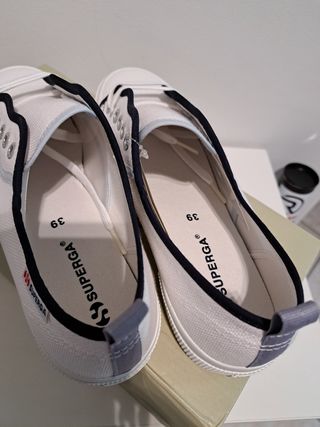 Scarpe Superga in tela bianca, taglia 39. - Modello classico. - Dettagli con bordino bluce azzurro. - Linguetta posteriore per facilitare la calzata.