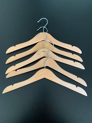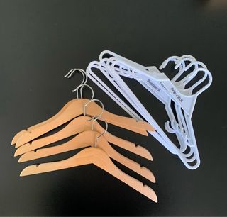 Set di grucce per bambini, ideali per organizzare l'armadio. - 5 grucce in legno naturale con gancio in metallo. - 6 grucce in plastica bianca con logo Prenatal.