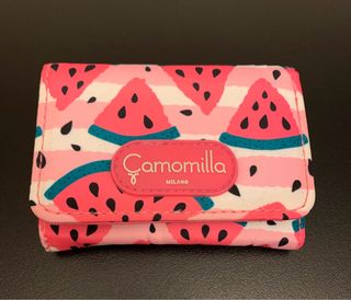 Portafoglio con una vivace fantasia di angurie. Nuovo mai utilizzato. - Design colorato con strisce rosa e bianche. - Dettaglio logo Camomilla Milano.
