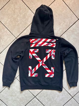 Felpa con cappuccio Off-White originale, realizzata in cotone. Presenta un design iconico con frecce e nastro a strisce rosse e bianche. - Logo Off-White sul retro. - Tessuto in cotone confortevole. Indossata soltanto due volte. Come da foto. Prezzo di boutique Off-White 560 euro.