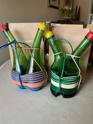 Set di due oliera/acetiera in stile vintage da bistrot, risalenti agli anni '60. Perfette per aggiungere un tocco retrò alla tavola. Sono soltanto da pulire all’interno perché usate . - Design a due bottiglie. - Tappi colorati. - Decorazione in filo colorato on plastica ( scubidoo)