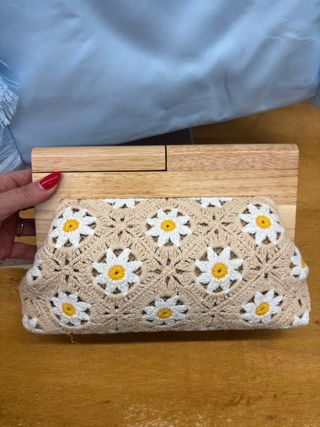 Pochette con un grazioso motivo floreale all'uncinetto. - Design a quadretti con margherite. - Struttura in legno.