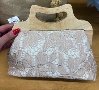 Elegante pochette con un raffinato design floreale in pizzo. - Manico superiore in legno. - Motivo floreale in pizzo. - Fodera interna.