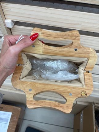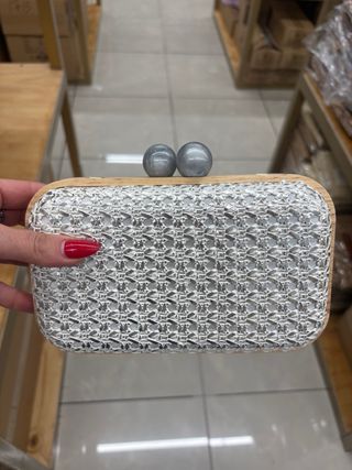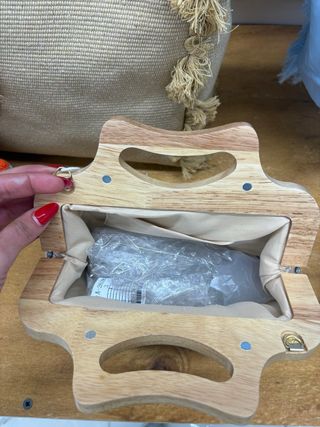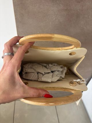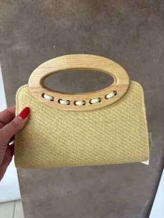 Elegante pochette con dettagli in tessuto intrecciato e finiture in legno. - Chiusura a sfera. - Design raffinato.